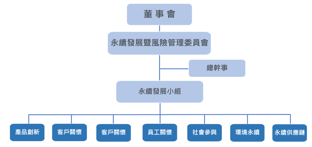「永續發展暨風險管理委員會」為本公司永續發展專責單位,轄下設有產品創新、客戶關懷、經營管理、員工關懷、社會參與、環境永續及永續供應鏈等七個小組,小組成員為各部處主管與成員,有效進行資源整合,將永續策略落實至各部處執行。