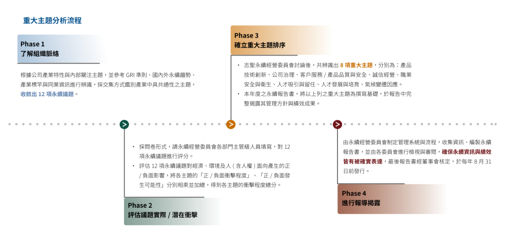 永續經營委員會依據臺灣「上市公司編製與申報永續報告書作業辦法」,採用 GRI通用準則 (GRI Universal Standards 2021) 鑑別重要利害關係人與永續議題衝擊程度,除作為永續報告書之管理方針,更可藉此盤點公司永續現況、持續推動相關政策落地,為社會與公司共創價值。