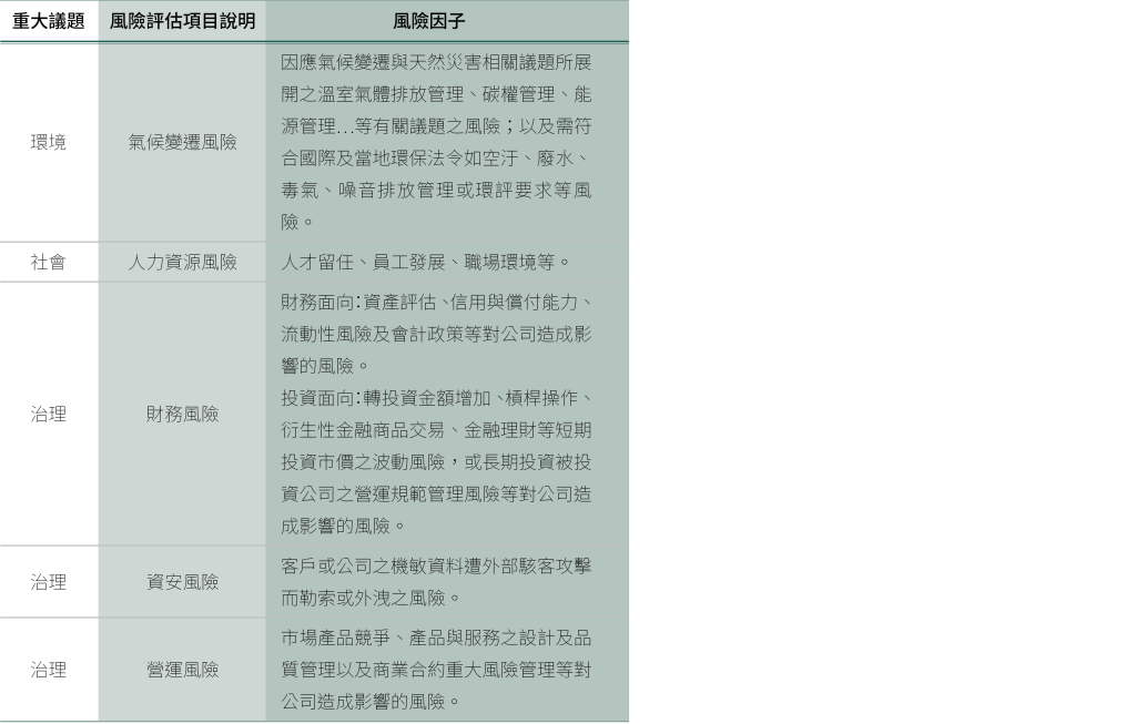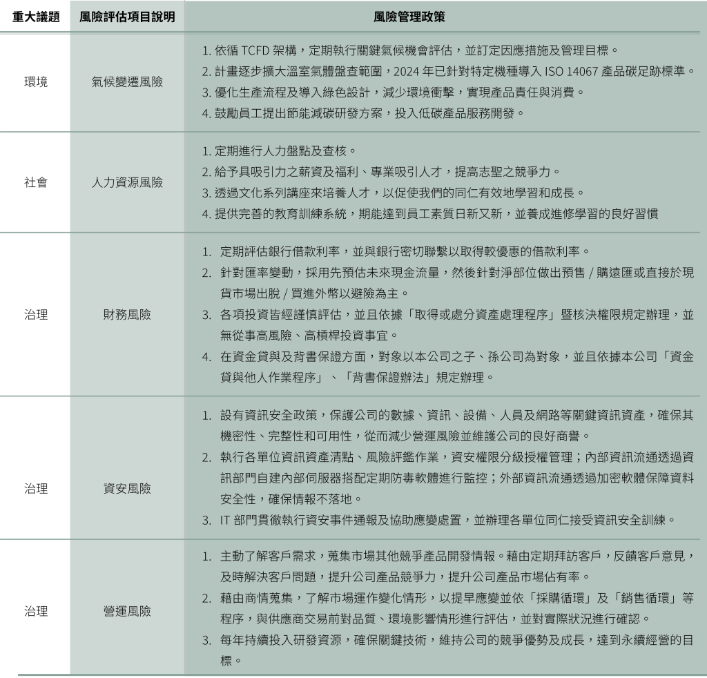 透過 「永續發展暨風險管理委員會」為主要權責單位,建立不同層級的管理制度並訂定內部規章,有效控制外部環境帶來的風險,以最小化風險影響。
